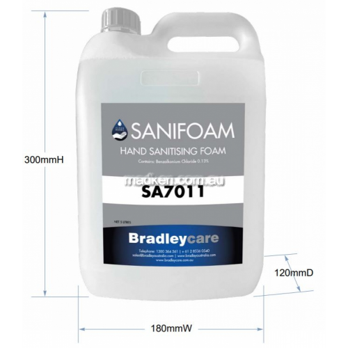 This Sa7011 Sanifoam Hand Sanitiser Foam Antimicrobial is a 100% original and authentic product backed 100% by its manufacturer Bradley. All our major brands that we supply such as Abc, Alltissue, Alvdo, Astrawalker, Avail Designs, Avenir, Barkly Basics, Best Buy, Billi, Bio Active, Bobrick, Bradley, Brady, Britex, Brodware, Calfarme, California Scents, Caroma, Castaway, Chux, Clark, Clorox, Con Serv, Deb, Depend, Doability, Dolphin, Dorf, Dormakaba, Dynamic Resources, Dyson, Eco Natural, Edco, Elyse, Enware, Franke, Geberit, Gentec, Glad, Hafele, Halyard, Hand Rail Industries, Henrietta, Hideaway, Huggies, Idc Medical, Jackson Safety, Jasol, Jd Macdonald, Jetdryer, Jetspray, Johnson Suisse, Kimberly Clark, Kimcare, Kimtech, Kleenex, Koala Kare, Madinoz, Mat World, Mediclinics, Mediflex, Meir, Metlam, Mitsubishi, Nero, Nover, Oliveri , Oso, Parisi, Poise, Pressalit, Primesource, Rba, Reece, Rogerseller, Rubbermaid, Scott, Steeldrill, Stormtech, Stylus, Superquip, Thornthwaite, Tork, True Blue, Ultrafresh , Velo, Verde, Visualise, Wd 40, Whiteley, Wondergrip, Worknplay, Wow Wipes, Wypall, Zip, are at the best prices available and have all original warranties and guarantees.